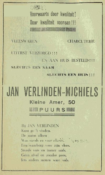 Jan Verlinden (1913-1999) en Martha Michiels (1917-2012) (Martha van de Krusser) hadden hier hun beenhouwerij ’t Zwijntje vanaf ca. 1949 tot 1974. Het vlees werd niet alleen in de winkel verkocht, maar ook op bestelling. Dagelijks werden de klanten bediend via een draagtoer door Martha, later bijgestaan door de zonen Marcel en Paul. Jan ging de dieren kopen op de markten van Anderlecht en Gent. Achter de winkel werd een werkhuis gebouwd, waar het vlees werd verwerkt en bereidingen werden gemaakt als pensen, kipkap en stoofvlees. Het was Martha haar levenswerk. De zaak werd niet overgenomen