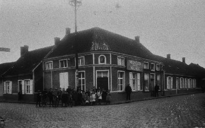 Onderste rij v.l.n.r. Cloostermans (?), Mathilde Van Assche en Frans Moons (schoenmaker). Bovenste rij x, Herman Daems, x, Modest Vanherstaeten, Isidoor Marnef (Vijverstraat)